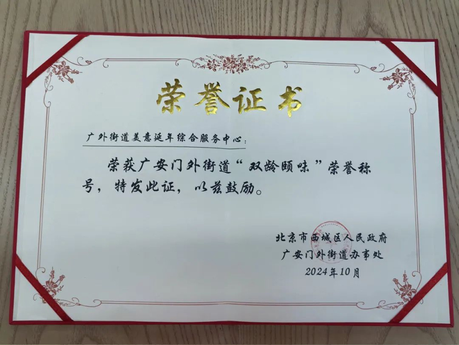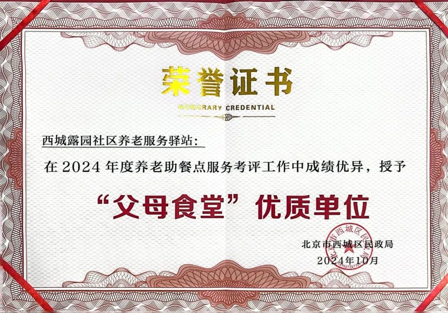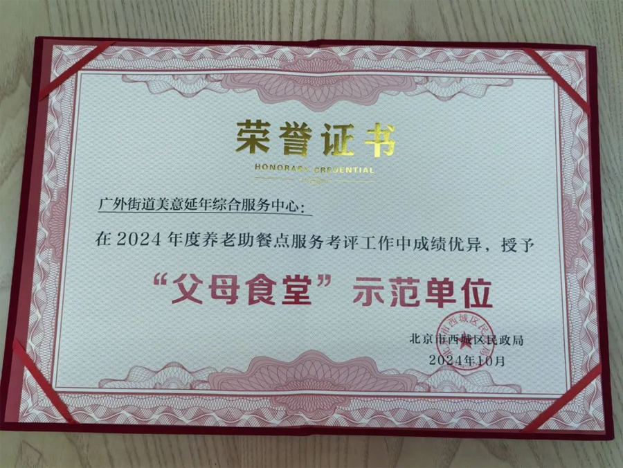 为解决居家长者“吃饭难”问题,西城区创建“父母食堂”品牌,推动养老助餐点建设,提升老年助餐服务保障水平。在2024年“敬老月”期间,西城区组织对全区“父母食堂”开展评比活动,从服务对象满意度、服务水平、餐品品质、卫生状况、便利程度、装修改造等10多个方面,开展综合性、全方位地评比,康健公司下属项目在此次评比中成绩优异,斩获多项荣誉称号。其中,广外美意延年综合服务中心荣获西城“父母食堂”示范单位、广外街道“双龄颐味”双荣誉称号;露园社区养老驿站荣获“父母食堂”优质单位称号。